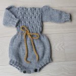 Grey knitted romper for baby or toddler girl, with long sleeves, drawstring at waist and buttons between leg openings for easy diaper change